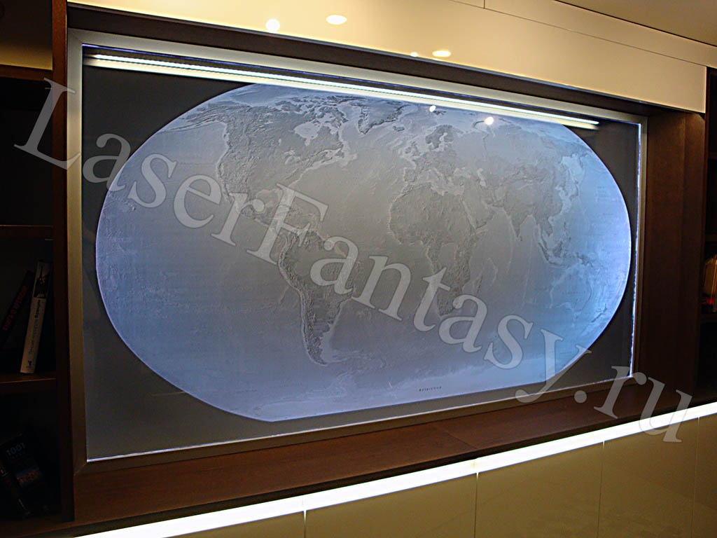 Политическая карта Мира на стекле, с лазерной гравировкой, подсветкой, в раме: 1800х1100х8мм -