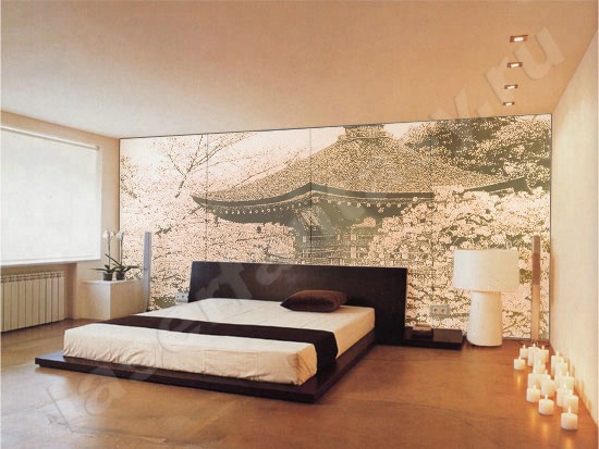 Сакура. Стекло зеркально-тонированное. Интерьер спальни. Панели для стен. Подсветка панели. Дизайн стен -