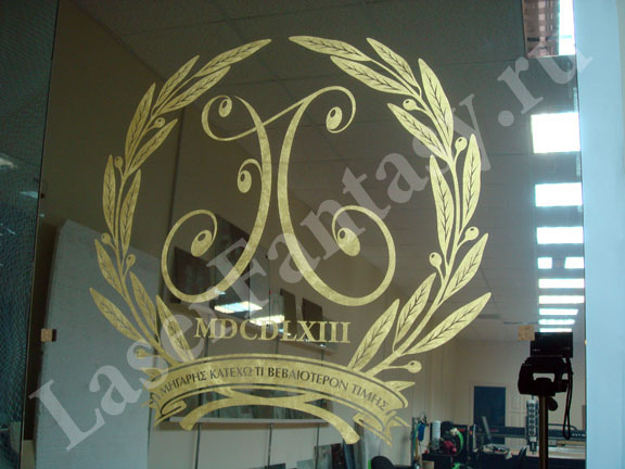Лазерная гравировка по стеклу. Гравировка обработана сусальным золотом. Элемент входной двери -