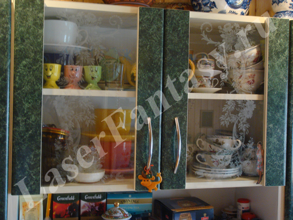 Интерьер кухни. Дизайн дверей и стекол для кухонных шкафов. Гравировка на прозрачном стекле -