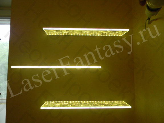 Стекло в интерьере с лазерной гравировкой: 1000х2000х12мм. Торцевая подсветка красного цвета -