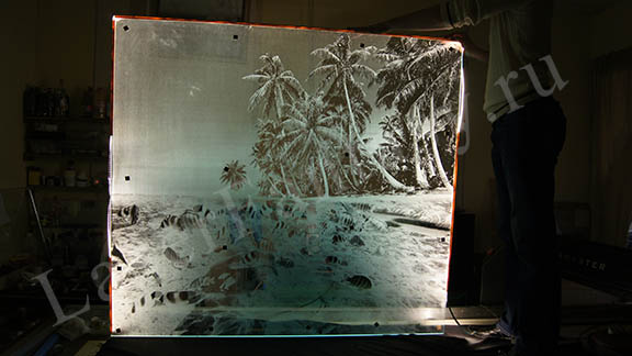 Лазерная гравировка на закаленном стекле. 1450х1950 мм. Элемент интерьера сауны с подсветкой -