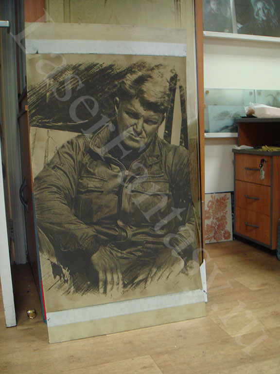 Гравировка портретов 470х650 мм на бронзовом стекле с титановым напылением ( 940х2210х6 мм) Александров и Орлова -